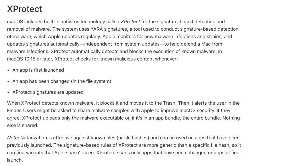 First, XProtect being signature-based will fail against mutation, and we will learn more about that as we go, and why Apple chose to stick with such a design. But here’s the trick: if we change even a single byte at runtime, the code signature breaks, and macOS will refuse to run that binary because its signature is invalid. Code signing is a huge part of macOS security, so this is important.